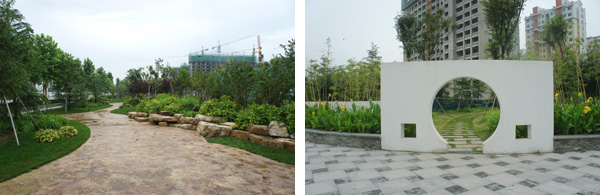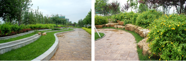 而在道路十字路口的节点处,则主要是用10cm×10cm的小花岗岩铺地,铺出来的路面整洁、平坦,看似简单,实则对施工技术要求相当高。草坪中的地面铺装,则采用花岗岩汀步,用错缝铺装法,两块花岗岩之间用草皮镶嵌,就像给每块花岗岩镶了一道绿边,与旁边的草坪和谐地融为一体。贯穿整个工程的游憩步道,全部采用"人字形"的铺装方法,中间用透水砖、两边以花岗岩镶边,透水砖价格不高,用以镶边的花岗岩是利用了铺装中剩余的边料,虽然用料简单,但通过对技术的严格要求,铺出的路面却整洁而不失韵味,是一种实用、环保、节约的做法。