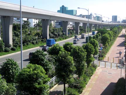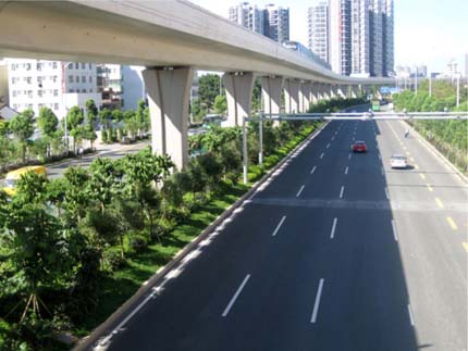 如今,开车行进在这条道路上,干净整洁的路面、开阔通透的视野、清新自然的景观,给人带来闲适、惬意的感觉?!耙匀宋?,尊重自然”的绿化理念,体现在景观中的每个细节;自然环境与城市环境的密切结合,使高架桥的道路通行功能与桥下中央绿化带的生态功能有机融合。整条道路,不仅体显出深圳这个滨海大都市独有的景观特色,更彰显出这个城市的生机活力与热情奔放。