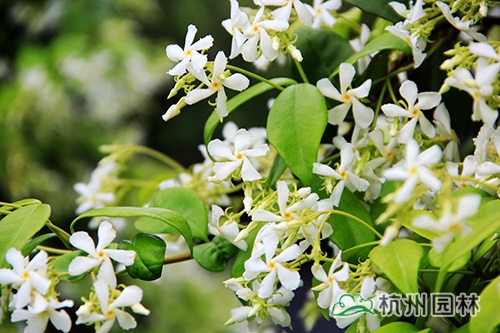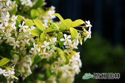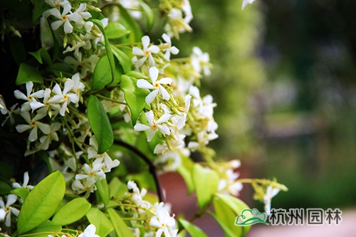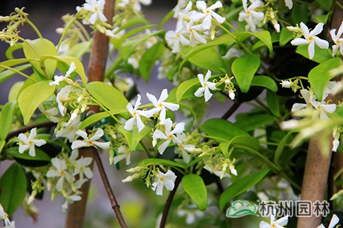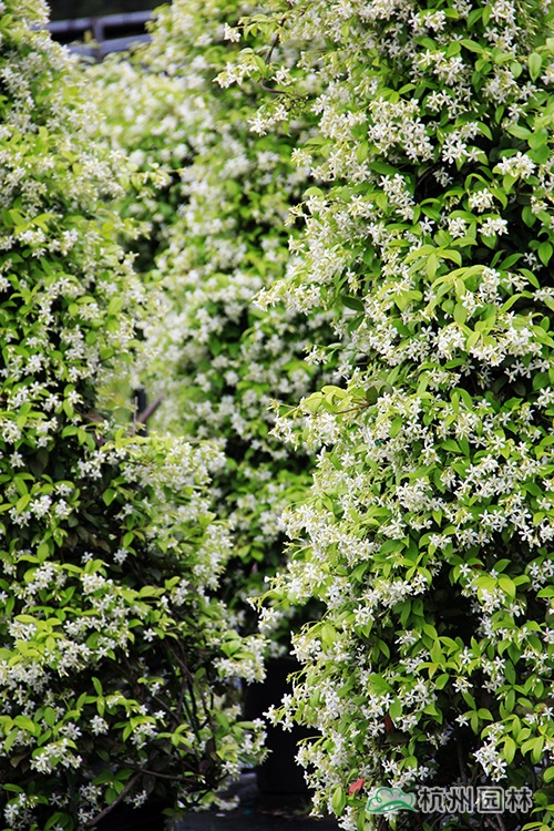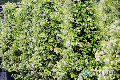 意大利白花络石藤(Rhyncospermum jasminoides),俗称风车茉莉,为夹竹桃科的常绿藤本,茎赤褐色,幼枝被黄色柔毛长,有气生根。常攀缘在树木、岩石墙垣上生长,是一流的藤蔓植物,四季常绿??ㄆ谠谙募?,5月进入盛花期,开花量极大,有茉莉的香味,闻起来沁人心脾。