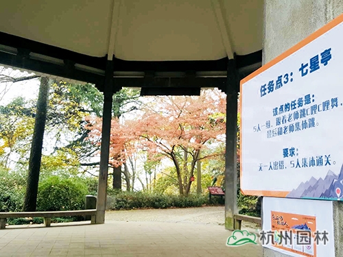 本次活动的终点为玉皇山顶的“江湖一览阁”。玉皇山是杭州绝佳的观秋景高地,站在山顶,可俯瞰杭州全城,八卦田的神秘、西湖的绚丽等尽收眼底;山上则是古树参天,红叶似火,黄叶赛金,彩林岑峦叠峰,如入画里。大家从玉皇山北门上山,途经林海亭、老玉皇宫、?;ǖ亍⒆侠炊刺?、七星亭,最后到达山顶的“江湖一览阁”。此次登山途中设立了3个任务点,参加活动人员需要完成相应任务,才能盖章通关。