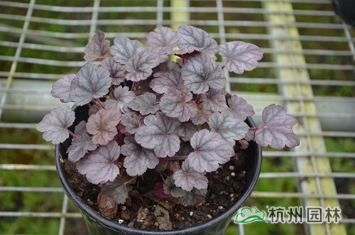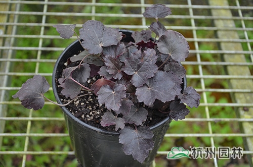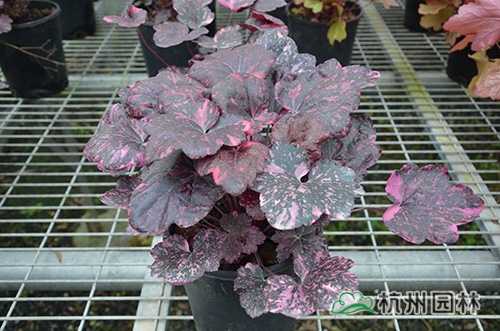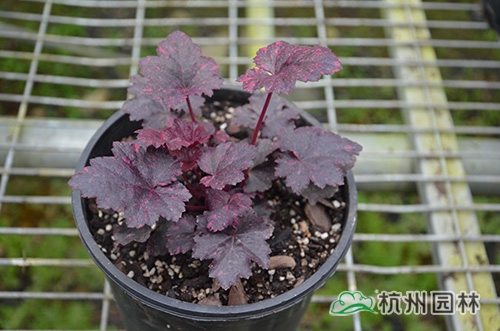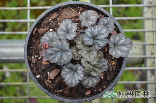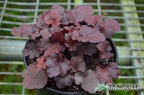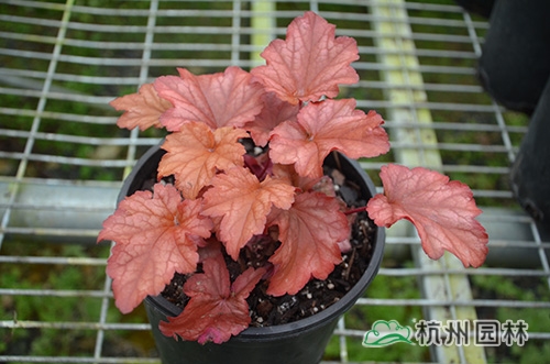 矾根叶形也变化多样,基部心形或楔形,掌状浅裂至深裂,边缘波状,浅根系,叶基生,花期一般为4~10月,花很小,呈钟状,两边对称。幼苗长势缓慢,成苗后生长旺盛。绿期长,能够在-15℃以上的温度下生长。具有喜半荫、耐全光、耐旱性和耐寒性强等生理特点。适宜富含腐殖质的土壤。喜中性偏酸,适宜的PH值为5.8~6.2,能够在倾斜地方生长。冬季不落叶,枝叶生长稠密,株型圆整,覆盖性强,花和叶都比较漂亮。