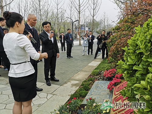 杭州市园林绿化股份有限公司董事长吴光洪(右二)陪同中央政治局委员、北京市委书记蔡奇(左二)参观浙江园
