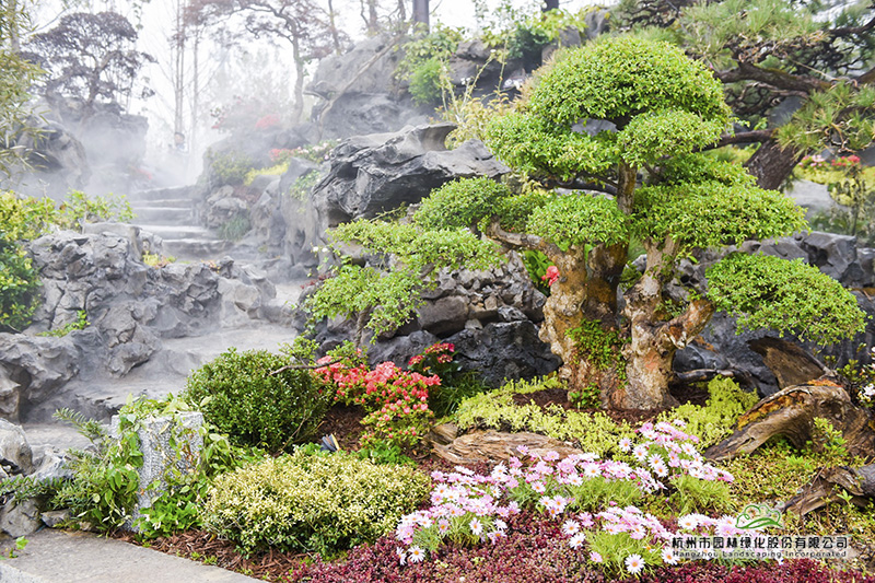 再往里走,富春山居照壁前的造型黑松和红花檵木,一左一右,遥相呼应,树姿优美,枝干舒展,仿佛热情欢迎远道而来的客人。这两棵树,是深化设计团队跑遍全国重要苗圃挑选回来的,让最美的一面呈现在游客面前。