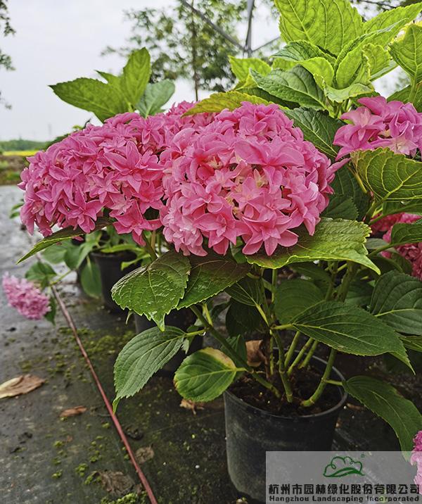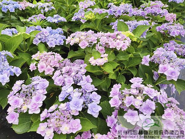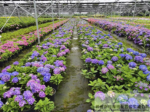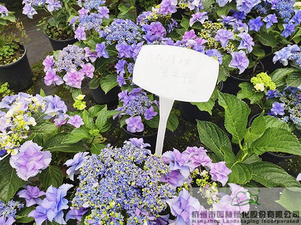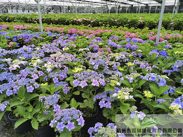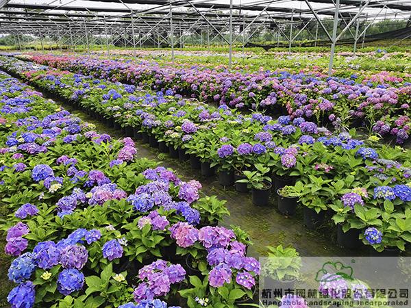 据悉,在画境种业径山基地,共有七八十个绣球品种,规格从1加仑到5加仑,能够满足家庭园艺和工程用苗的多种需求。通过近几年的生产和繁育,径山基地不断筛选优良的绣球品种,目前,基地里的这些品种表现都比较好,比如红色系的摇摆乐、汉堡、花神,花色红艳,花朵硕大,在一众绣球中表现非常抢眼;花色丰富多变、宛如一颗颗璀璨宝石的蓝宝石和蓝色妈妈;花朵宛如蝴蝶翩跹、花色充满梦幻感的佳澄;花朵密集、犹如一大捧五颜六色爆米花的爱莎;开花早、花期长、花色渐变的蓝色海洋;花开时,宛如一只只白色小鸟在枝头纷飞的泉鸟;花团锦簇、花期超长的无尽夏……可以说,每一种绣球的花色、花形都各不相同,极具特色,充满了夏日的浪漫情怀。