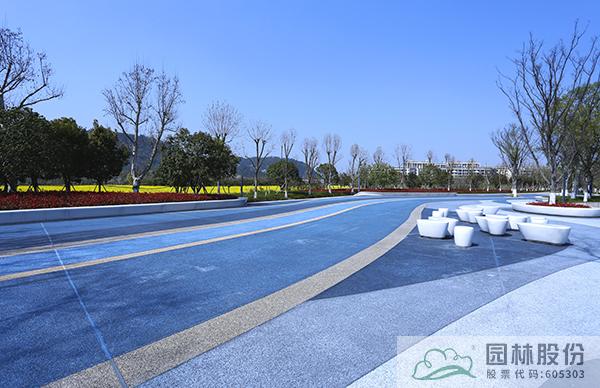 从各个广场到沿溪绿道,全部采用透水混凝土材料,并在兼顾排水功能的同时,通过色彩、图案的变化,营造移步换景的滨水景观。广场铺装主要选用深灰、浅灰、土黄等色彩的透水混凝土材料,根据现场景观配色需求,设计不同的铺装组合,营造大气自然、丰富多变的广场景观。灵溪公园入口处的波纹广场,则以蓝色透水混凝土材料为主,搭配亮丽的黄色,营造出流畅自然、色彩明亮的波纹效果,充满了流动的旋律,再加上极富特色的异形树池、坐凳,整个广场又呈现出时尚的现代风情,带给人们更加丰富的滨水景观体验。