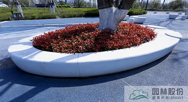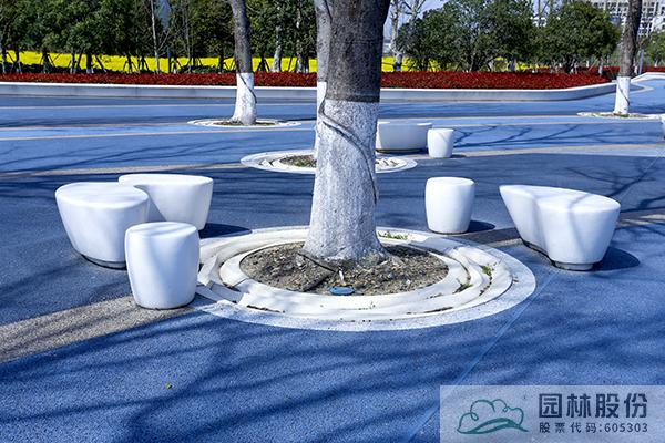 造型丰富美观的泰科石坐凳和树池是项目中的一大亮点。在波纹广场和儿童乐园等地方,采用高强度复合无机泰科石材料,造型为圆形、椭圆形、异形的各种坐凳和树池,错落有致地分布,洁白的颜色与彩色的混凝土铺装相映成趣,既可以作为行人休憩的地方,又成为景观的一部分。这些坐凳和树池均以模具工艺成形,造型美观,集现代休闲与实用功能于一体,表面光滑平整,自洁性好,抗污染强,维护简单,只需擦拭后水管冲洗即可。