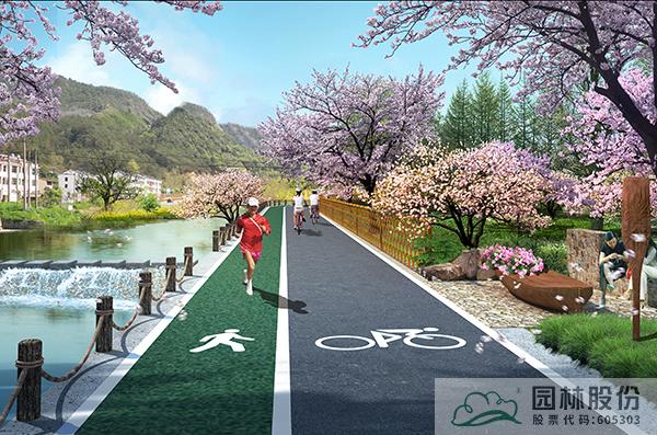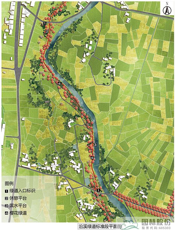 沿溪绿道为?;ɑ分斜鹾佣温?,该标准段长度为730m,总长2590m。以春季樱花为主题,打造浪漫的滨水慢行系统,沿线打造休憩空间,设置休憩设施,并在入口处设计特色标识,成为村民通行休闲健身的浪漫步道。
