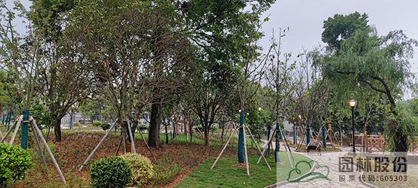 公园内部增加流线型道路系统,以复层式开敞组团进行植物配置,以枫香为主题植物,搭配乌桕、朴树、榉树、柳树等配景植物,下层种植美人蕉、石蒜、麦冬等,丰富植物层次,营造较为有序且精致的植物景观,同时设置景石、景观小品等增加亮点。