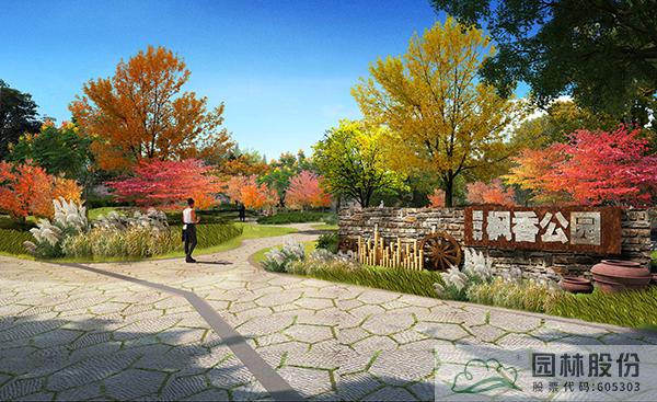在公园入口设计标识景墙,起一定指示作用的同时又能形成亮点,增重彩叶树种及开花树种,下层以麦冬、菖蒲等植物搭配景观小品组成植物组团,留出一定的草坪空间,形成开合有致的植物空间,增加景观的美观度。