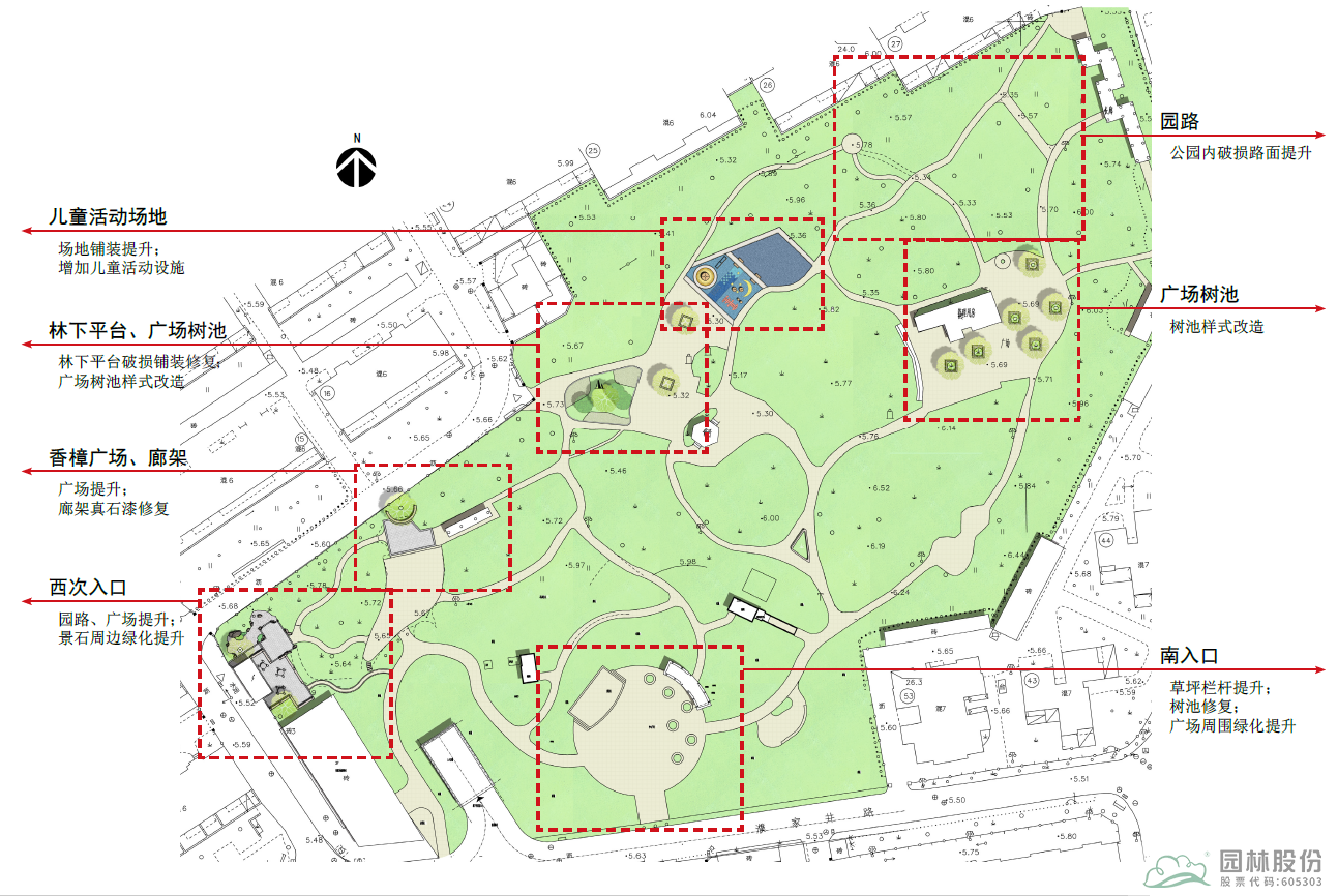 对公园内破损路面及广场进行修补;对通往公厕的园路进行改造,铺设沥青;对被破坏的树池进行扩大改造。