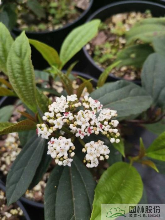 忍冬科荚蒾属,落叶灌木。进口品种,植株直立性强,分枝多,枝条较纤细?;ㄎ位ǎ稍谢ㄖ芪埔蝗Σ辉谢??;看?,随着时间的推移,花色由绿色转为白色,最后呈粉色。果实鲜红色,观果期长,大量鲜红的果实挺于叶面之上,颇有丰收之象,为荚蒾属中粉色系为数不多的品种之一,适合园艺盆栽或庭院观赏。