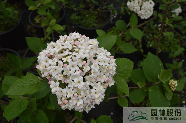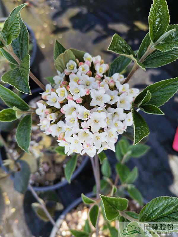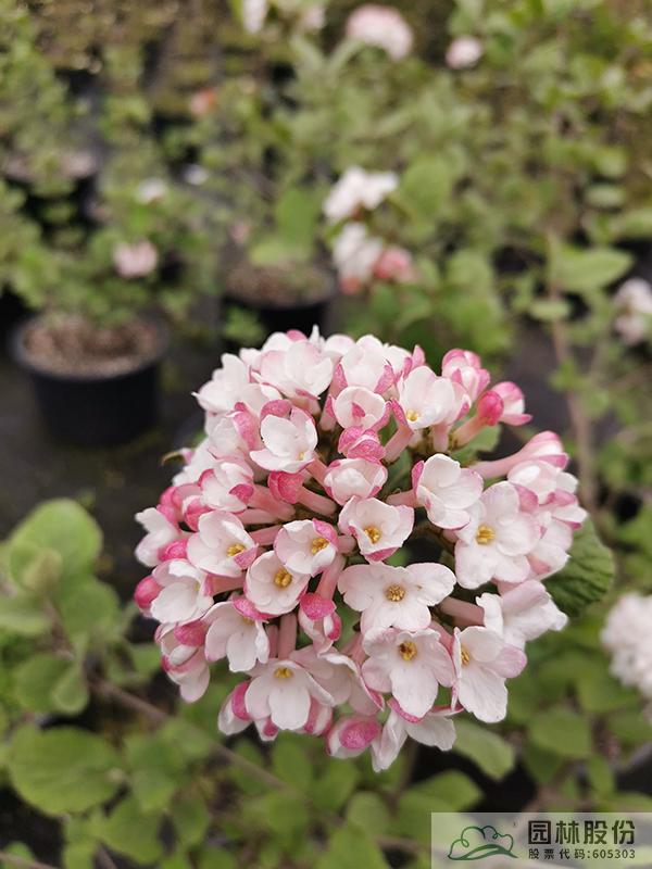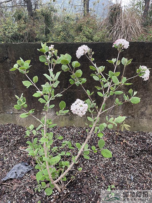 忍冬科荚蒾属,半常绿或常绿灌木,株高2-3 m,为红蕾荚蒾和烟管荚蒾的杂交种。叶色深绿,秋季转红,颜色程度因所处地区而异。该种继承了红蕾荚蒾粉花的优良基因,花序未开放时呈现靓丽的粉色,开放后白色,且具有较浓郁的花香?;ň兑话?.5-10 cm,花期3-4月。植株具有良好的顶端优势,枝条年生长量大,但分枝能力稍弱。几乎无病虫害。适应性强,生长速度快,耐干旱且耐寒,适合自然风格的工程应用或庭院观赏。