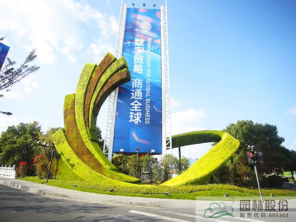 为增加数贸展会主题在边侧带内设置3座绿雕:杭扇-以扇子造型主题的全球数字贸易博览会绿雕,展-以全球数字贸易博览会会徽造型绿雕,数贸-以飘带造型主题的“数贸钱潮 杭向未来”绿雕。绿雕植物均采用佛甲草和五色草搭配,周边采用三角梅及花镜植物配置。港南大道岛头花镜运用金姬锥、彩叶球、细叶芒、塞娜等植物来强化迎宾气氛,通过多年生地被草花,结合精致植物组团+特色绿雕,共同营造多彩氛围,打造热烈迎宾门户。